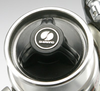 シマノマーク いまは使ってませんが、ドラグノブにシマノマークが入っています。これは「無限を表す楕円」に、左右に出ている自転車のペダルを組み合わせたもの。同時にしなる釣竿も表しているというものです。 でもこれ、見ようによってはテニスボールやゴルフのクラブにも見えます。たしか、シマノが自転車に加えてもうひとつスポーツ事業をやろうとしたときこれらも候補に上がっていたと聞いたことがあるような・・・。なんにでも使えるデザインだったとか? ちなみにこのドラグ、90度くらいでフリーからロックまで調整できます(おいおい)。それとこのナット、かかりが少なくてすぐつぶれます・・・。 |