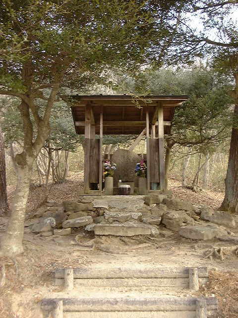 202段の表参道(上から) これが表参道。前をバイクで走ったのに見逃して良かった。見つけていたら登っているところだった。ちなみに丘の山の裏側の方に車で上る道はあるようだ。 |