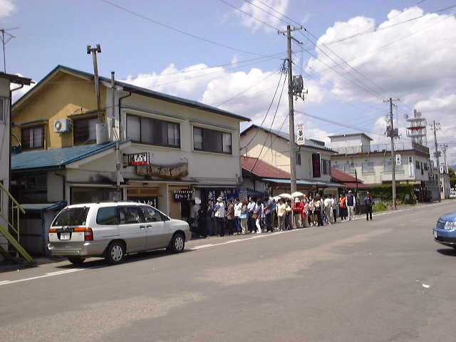 | まこと食堂の行列 磐梯河東インターで磐越道をおりる。 12:00頃 喜多方駅着。そこから歩いてラーメン屋巡りに繰り出す。ここは「まこと食堂」。おいしいと評判なのだが、この行列。これだけの客にラーメン出してスープ足りなくならないのか心配してしまう。K.Tanakaさんは並びたそうだったが、時間ももったいないので写真だけ。 |