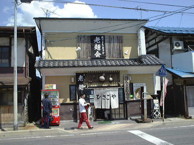 | 13:00ころ。「ひさごや」 せっかく来たので、もう一軒行こうと言うことになり入ったお店。町の中心部にある。ライダーの先客が十数名いた。ビールなんか飲んでるが・・・良いのか? |