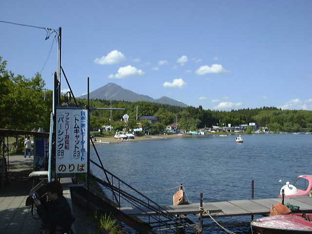 | 猪苗代湖から磐梯山 13:30ころ、喜多方を出て、とりあえず猪苗代湖へ向かう。特に感想はないが、亀だの鯨だのと言う形をした遊覧船が、いかにも観光地と言う感じでほのぼのしていた。ここで、この先の行程を検討。ワインディングを走ろうと言うことになり、桧原湖方面へ向かう。 |