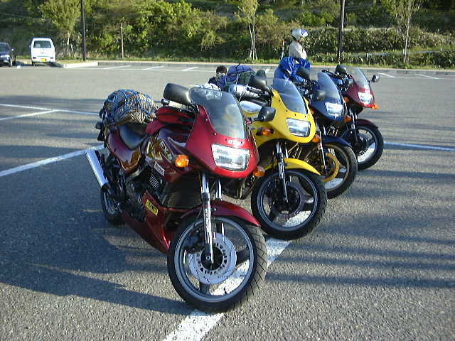 道の駅「裏磐梯」にて。 EX−4が4台というのは、個人的には新記録。いつのイベントも3台だったので。カスタムはMuzzy管がK.TanakaさんとUMEさん。浮き草さんはNinja用のFディスク。浮き草さんだけタイヤがミシュラン。前か後ろかどっちかがラジアルだったような・・・・。残り3人はお約束のGT501。アンダーカウルは浮き草さんだけ。 ここでK.Tanakaさんと別れ、宿泊地の道の駅「喜多の郷」へ。 一人で帰るK.Tanakaさんがかわいそうな感じだ。すみません。能天気に休暇など取ってるもんですから・・・。 |