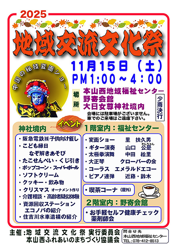 | 「「2025 地域交流文化祭」 令和7年10月15日(土) 13:10〜16:00 場所:本山西地域福祉センター (東灘区西岡本4-8-7) 受付:12:50〜13:00 主催:地域交流文化祭実行委員会・本山西ふれあいのまちづくり協議会 |