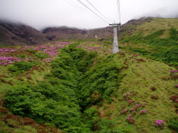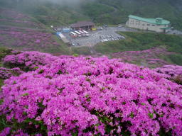 駐車場に到着。天気が悪いが観光バスや自家用車が結構停まっている。20〜30台位か。皆ミヤマキリシマ目当てか。準備をしてロープウェイ乗り場に向かう。片道だけチケット購入。12時20分発に乗る。数人しか乗客はいない。