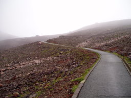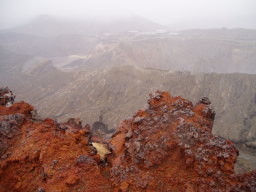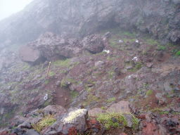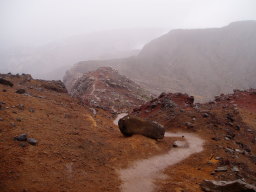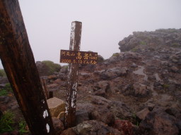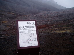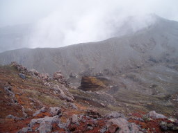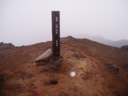 観光コースはここまでで、この先は瓦礫の中の登山道になる。道はそれほど泥だらけではなく、しっかりしている。中岳までそれほどかからず到着。ガスっていて展望無し。