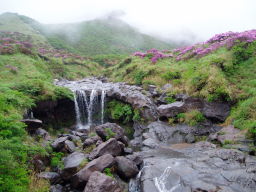 進行方向左側に綺麗なミヤマキリシマの群落がある。酔仙峡駅は900mで中腹までは緑が広がるがその上は瓦礫である。終点の火口東駅1285mに到着。早速歩き始める。雨は小降りでカッパは最初着なかったが途中から雨風が強くなったので着る。