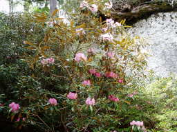 | 山頂に咲いているシャクナゲ | 山頂直下にある岩場をくだる団体 |