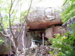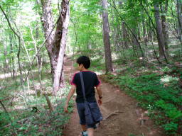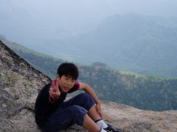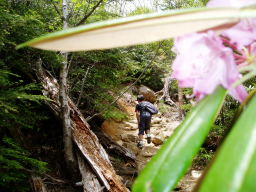 甥っ子も最初は戸惑っていたが難なくクリアしていった。シャクナゲが咲く岩ゴロゴロの登山道を這いあがると大きな岩があった。そこで休憩。ちょうど軽スタイルの若者2人がひぃひぃいいながら登ってきた。