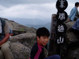梯子を登り少し進むと岩場に大勢の人がいた。瑞牆山山頂である。山頂には40〜50人位いるだろうか。まずは山頂標と甥っ子を込みで撮影。人が多いので順番待ちである。