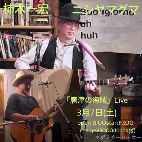 3月 7日(土) open 18:00 start 19:00 charge 3,000円(1drink付き) 柿木一宏 ニシヤマグマ ![]() |