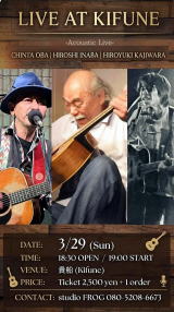 | 29日(日) | 『 貴船 』 日田市隈1丁目 未来ビル2階 open 18:30 start 19:00 charge 2,500円 + オーダー |