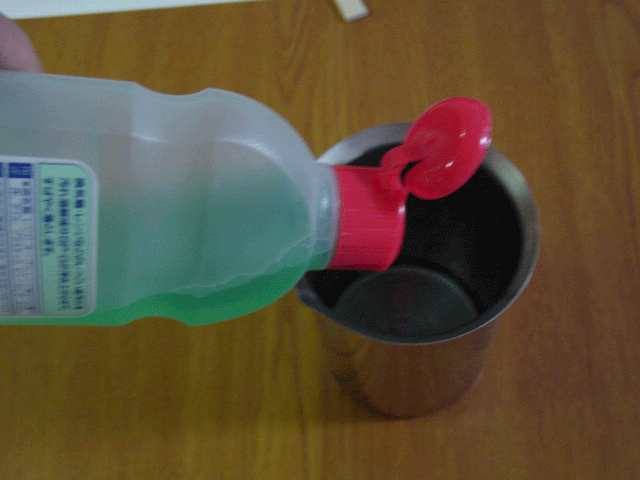 1,強力なアルカリ性(せい)の洗剤(せんざい)を2〜3倍の水でうすめる。