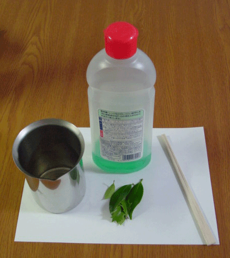 3,葉っぱを洗剤(せんざい)の中に入れる。