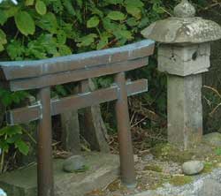 鳥居下の真ん中の石の下に葉っぱを置きました。一人一枚。