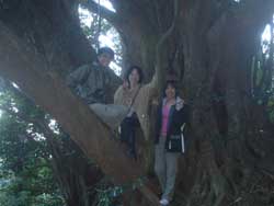 調査が終わった学生が戻ってきて、オオミズナギドリの巣まで案内してくれました。山荘から少し山の中へ入りますが、その途中にあるスダジイの木に登って、私たちはヤッホー(笑) この木は、地面から飛び立てないオオミズナギドリの滑走路になっています。一生懸命登った爪痕があちこちに!ヒナ達よ、親の軌跡を辿って大海原へ羽ばたくんだぞ!