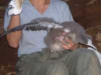 巣の中から、むんぎゅと取り出されたヒナ。足輪がついていて、研究に協力してくれているいい子です。大きさは、もう親鳥くらいとか・・