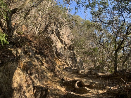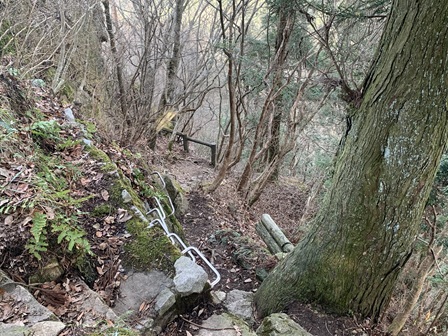 うわっ、なんたる下り、岩肌の手摺が頼みの綱ではないか・・・順打ちのお遍路さんであれば結願前の“最後の修行”と言ったところか。慎重に下ると続いて岩ゴツゴツの道なき道となり、これも修行と割り切る。 個人的な経験では巡礼道の険しさトップは「三仏寺投入堂」(鳥取県)への道だったが、ここもかなりの凄さであった。 |