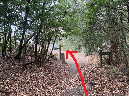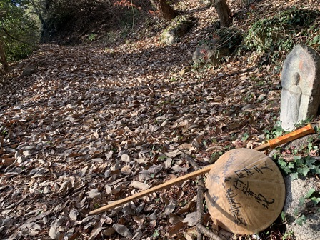まず根香寺への道は概ね舗装道であるが所々は右写真のような旧道になり、道脇の丁石が遍路道であることを教えてくれる。冬の落ち葉をサクッサクッと踏みしめながら道を進める。 |