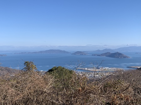 やがて見覚えのある景色(左前方は自衛隊演習場)が現れた。ここから道は下りとなる。坂出市の看板によればイノシシの出没があるらしいが、幸いに遭遇することもなく白峯寺へ。 |