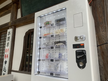勤行を終えて納経所で朱印も頂き、さて出立しようとふと見ると面白いものが目に入った。右写真は自販機なのだが、なんと絵馬・線香・ロウソク・寺名入り手拭い等がセットされているではないか。 後日知ったところによれば、このような自販機は白峯寺に限らず全国的に普及しつつあるらしい。寺院での取扱品が単なる商品の如く扱われているのはやや興醒めな気もするが、窓口が混んでいたり慢性的な人手不足等の理由があればむしろ理に叶ったアイデア手法なのかも知れない。 |