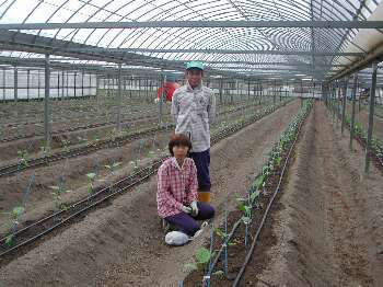 サダトシさんちは奥さんと二人で、千両ナスを25a作っています。(9月吉日撮影) サダトシさんは、千両ナスで、篤さん、富義さんらと早くからマルハナバチに取り組んで 頑張ってます。奥さんが、大きな声ではいえませんが、腰痛になられていた時 マルハナバチ君は大活躍したのです。 今年は、灌水もドリップ灌水に変えて、黄色蛍光灯も設置して、 タイリクヒメハナカメムシを放飼します。 放飼予定日:10月10日と17日 安芸の名人名簿へ