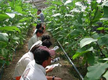 キヨシさん、ヒサオさん、キクコさん圃場などタイリクヒメハナカメムシ導入予定ハウスを巡回。