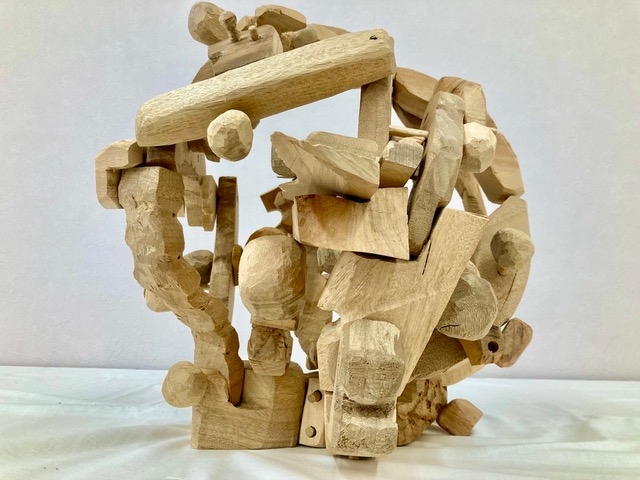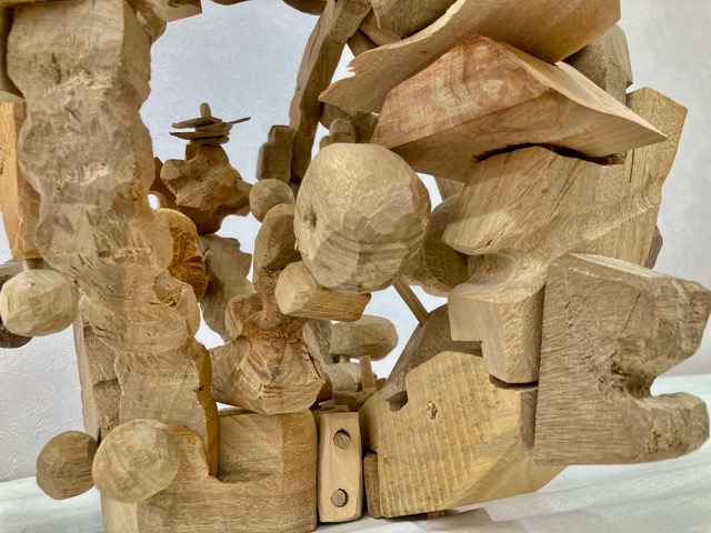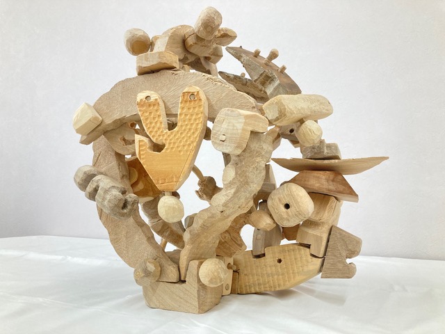 泡宇宙は、宇宙の大きな構造についての1つのモデルです。宇宙は、泡立った石鹸のように、無数の泡が幾重にも連なったような構造で、それぞれの泡の内部は巨大な空洞で、回りの膜面に銀河団などが分布するというイメージです。これまでの作品をつくった時の残りの多くの材料を集め組み合わせてつくってみました。銀河や星々だけでなく、動物や植物などあらゆるモチーフを組み込むようにと考えながらつくりました。見る角度によって如何様にも見えるようです。