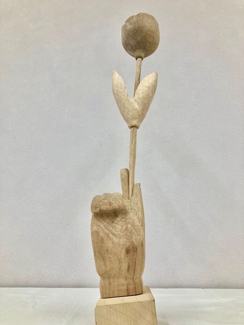 Kさんはその他、大黒様や恵比須様も展示していました。またKさんの「横綱土俵入り」は、私にとってはまったく初めての造形だったので、印象に残っています。両脚を大きく広げて中腰の姿勢、左手は斜め下に伸ばして広げた手のひらで前下向きにぐっと押す感じ、右手は肘を横に広げて肩の高さまで上げ手首をぎゅっと内側に曲げて巻き込むような形、さらにまわしとともに、開いた両脚の前面にひらひらの飾りのようなのがついた化粧まわしが垂れ広がっています。そして、肩や腕、胸の筋肉ももりもり、大野里の横綱昇進を祝って彫ったとのことです。