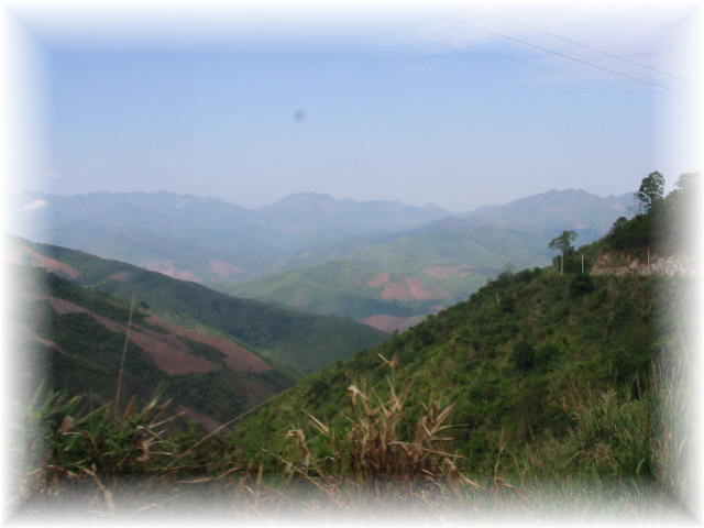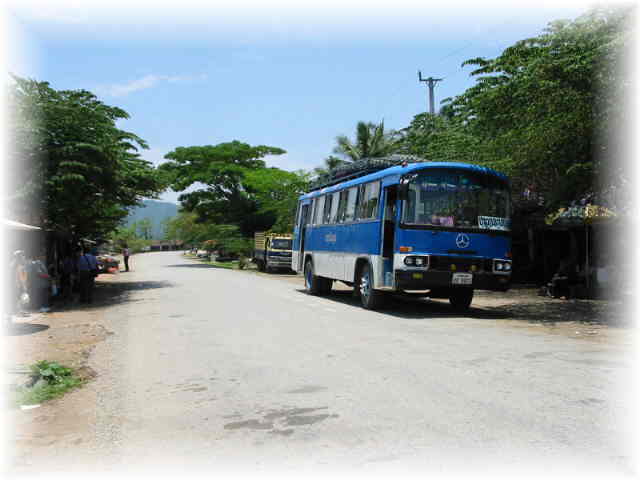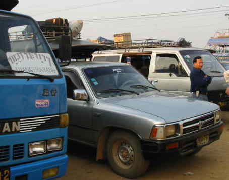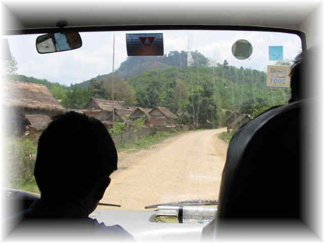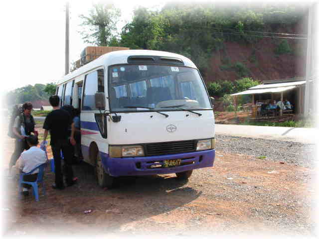 翌朝は6時起床。宿はボロだったが、チェックアウト時の部屋のチェックが無いところは少しだけ外国気分だった。7時前にバスターミナルに着き切符購入(20000キップ)。バス、ではなくトヨタのピックアップトラックだった。助手席には運転手の知り合いらしきおばさん、後部座席は狭いながらも一応特権席らしく、韓国おじさん、僕、坊様の3人が入り、あとは荷台のベンチシートとなる。韓国おじさんの話だと、カナダ人はどうやら車をチャーターしたらしい。座ってみるとほとんど体育座りで曲げた足とお尻が痛みそう。この「バス」、7時半にバスターミナルは出たものの、修理屋、店、知人宅、ガソリンスタンドなどで数々の用事をこなして、ようやく8時半近くなってウドムサイの街を出発した。すでに尻が痛いし、腹具合も心配だ。さっさと出発してくれ。