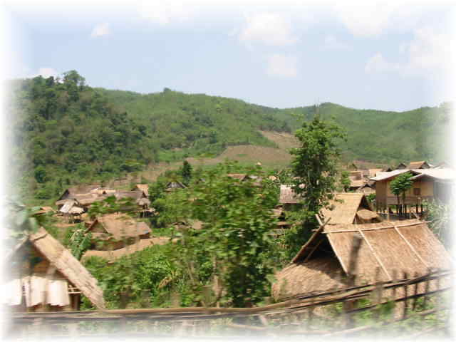 ボーテンの静かな道を行くと、ミニバス一台とトラックバス一台が止まっていた。バスはウドムサイ行き、トラックはルアンナムター行きとのこと。バスのほうに座席を確保してからスプライトを買う。3.5元とのこと。キップでは?と聞くと3500キップだそうで、両替をしたことで少し得をする。時計はラオス時間に変わったので現在8時。出発は客が一杯になってからというところがさすがである。客のほとんどは中国人で、外国組はカナダ人2名、韓国人1名と僕だった。バス代は15000キップ、または15元。9時、ようやく運転手が納得したようでエンジンがかかる。ラオス側の道路はひどいと物の本には書かれていたが、現在のところ舗装道路。でも、両側は緑でいっぱいで、草いきれで息苦しいほど。20分ほどでルアンナムターとの分岐点。この先からだんだん舗装が怪しくなってきた。舗装、未舗装が交互に現れたり、元舗装道路らしき道だったり。時々通過する集落は、木造高床式、壁は木(竹?)の皮を編んだものが多いようで、このあたりに国の違いが現れる。バスの揺れに任せ、山道を上下するうちに、ちょっとした盆地に入る。コンクリート作りの家が増えてきたと思ったら、13時、終点ウドムサイに到着。バスの中で一緒だったおじさんが、近くの宿を紹介してくれる。華人経営の宿。料金表にはシャワートイレつき40元と書いてあったが、30元(30000キップ)と言ってきた。後から来た韓国人のおじさん、カナダ人のカップルには40元と言っていたので、中国語割引と解釈。カナダ人は別の宿を探した様子で、韓国おじさんは一ベット10元の共同シャワー部屋へ。この韓国おじさん、後で話を聞くと、すでに中国を3ヶ月旅行しているとのこと。60歳近いとお見受けするが、すごいパワーである。