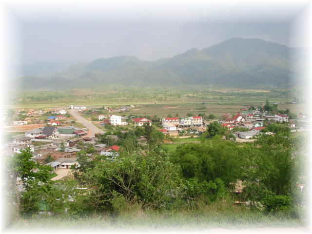 仏塔から俯瞰したウドムサイ中心部(左)とルアンパバーン方面への道(右)