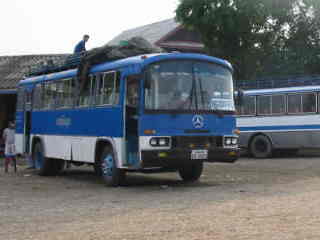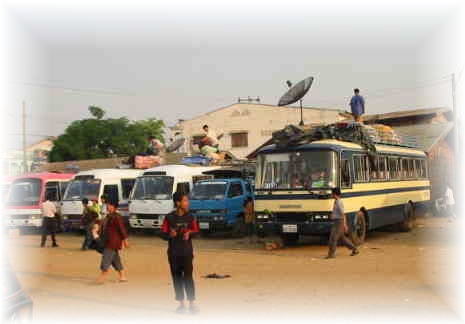 ウドムサイバスターミナル(左) ルアンパバーン行きバス(?)(右) バスにもいろいろある。