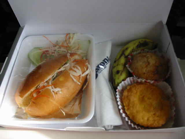 ビエンチャン〜昆明の朝食。メニューは、サンドイッチにサラダ。マドレーヌ、カップケーキ、バナナ。