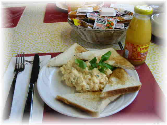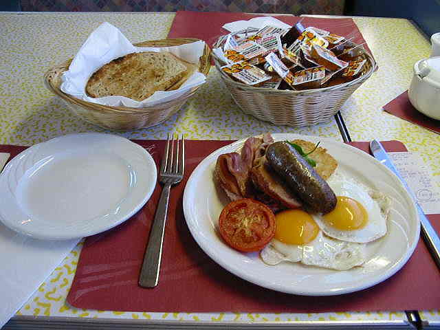 翌朝起きてびっくり。世界は緑の牧場と花の世界。昨日の荒野が幻のようだ。すっかり食堂車に惚れ込んだ日本人2人組みは最後の食事を。今朝は軽くトーストとスクランブルエッグ。到着の朝の食事。中国ならば営業しないかもしれないが、こちらは清潔なダイニングカーで最後の満足。