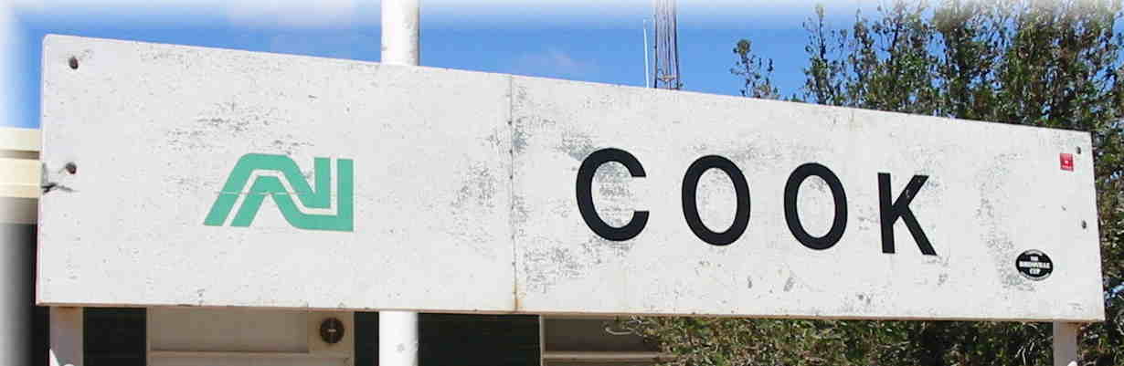 一息つくディーゼル(左)と、クック駅の看板(右)