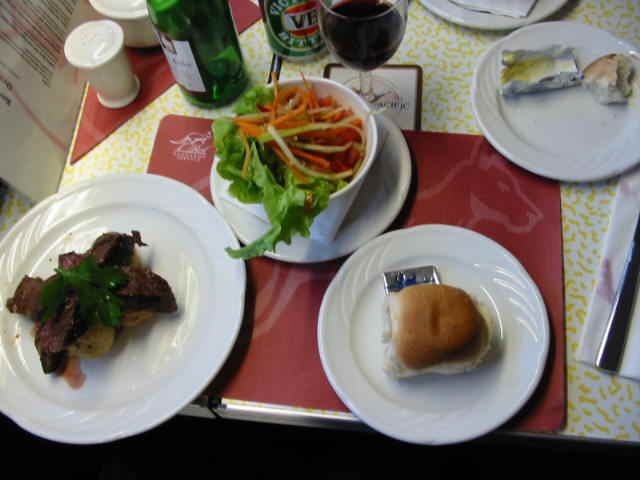 引き続き荒野、荒野、荒野…。夕方、カンガルーがひょっこり荒野に顔を出す。時計の針は南オーストラリア時間から西オーストラリア時間に変わったが、車内放送で食堂車の営業開始を知らせる。さて、今日のディナーはカンガルーを見ながらのカンガルーフィレ。我々の隣に座ったのは、アデレードで出会った中国系マレーシア人のお二人。意気投合し、英語、日本語、中国語の3ヶ国語が飛び交う。あちらのカンガルーフィレは来たのにこちらが来ない。車掌ならぬボーイさんに聞くと、どうやら注文がこんがらがってしまったらしい。マレーシア人が「このカンガルーは新鮮か?」ボーイ曰く「今撃ってきたばかりだ。こっちの2人の分はいま獲物を狙っているところだからもう少し待ってくれ」。カンガルーにはかわいそうだが、笑ってしまう。ようやくカンガルーセット、登場。ワインが足りなくなって、もう一瓶追加。意外とやわらかくてうまい。カンガルーさんの顔を見てしまうとすこし可哀想だが。