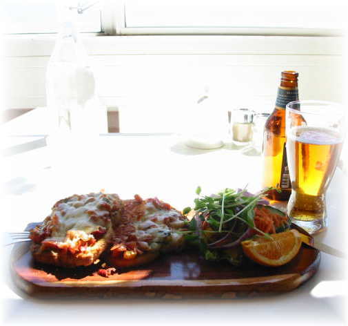 左:海を眺めてしばしお昼寝。そして… 右:海辺のレストランでピザトースト