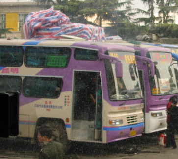 午前中に昆明駅前バスターミナルへ切符を求めに行く。午後5時発、翌朝8時着とのこと。出発時間が少々早いなと躊躇していると、客引きのおばさんが脇から顔を出す。「最新型のバスだよ。間違いないから」だそうだ。おば様に言われるまま、実地検分。確かに最新型らしい。寝台も3列だし、快適そうではある。正面窓は、すでに「昆明〜香格里拉」の表示が…。運転手の「うちのバスは間違いなく時間通り出発するから、ちゃんと5時前にバスに乗ってね」の言葉につられ、切符購入。
