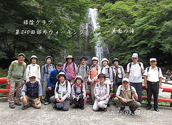 | 2022.09.28 (水) 緑陰クラブ(240回)郊外ウォーキングで箕面の滝へ! 今日は緑陰クラブの仲間16人で箕面の滝にハイキングに行ってきた。この滝へは過去何回も来ているのだが、毎回快適なウォーキングになっている。 阪急電車の箕面駅から約2キロの滝道を歩く途中には瀧安寺という宝くじの起源である富籤の発祥のお寺として知られている。 このお寺で小休止した後、箕面滝まで約1.5キロほど続く、川沿いの道を歩いて行くと、野口英世像が沿道沿いに建てられている。 彼は大正4年にアメリカから帰国したあと、母親のシカと一緒に滝道にあった「琴の家」という食堂での歓迎の宴で老いた母親をいたわる様子が皆の涙を誘ったと言われている。 ![]() 「琴の家」の関係者が自らの浄財を投じて「琴の家」が見下ろせる場所にこの銅像を建てたと言われている。 ここからさらに20分ほど歩くと、昔、唐からきた役人が箕面大滝の素晴らしい評判を聞いて、この大滝を観に行く途中、この巨岩までやってきたがその岩の大きさと山道の険しさに恐れをなして引き返したという伝説がある。 ![]() ここからさらにしばらく進むとやっと箕面大滝にたどりついた。 この日は天気も良くて、川沿いに連なるモミジの木の緑の葉が素晴らしくきれいで、これからまもなく迎える紅葉時には素晴らしい景色に変更していると思うと是非もう一度この道を歩いてみたいものだとの想いを強く持ったほどだ。 大滝にたどり着くと既に大滝の見にやってきていた見物客も多くいた。 大滝をバックに記念写真を撮ろうとして集まったときに、近くにいた人に頼んでシャッターをきってもらったが、案外見事に滝をバックに撮影されていた。 この2キロの滝道はほとんど高低差がなくて山道にしては歩き疲れも少ないので、ウォーキングを兼ねて毎日やってきている人もいるみたいだ。交通も便利なので自分も将来一人でもこの滝道を歩いてみたいと思う感じもしてきたほどだ。 この箕面の大滝を眺めながら昼食時間を取ったが自然に囲まれての昼食もまた違った美味しさが感じられた。 一時間ほどで箕面大滝をあとにして、来た道を帰ることになったが、今回のウォーキングには途中にある「箕面公園昆虫館」に寄る計画もあり、参加者のかなりの人が見学したみたいだが、自分は以前に何回も訪れたこともあるので今回はパスすることにして早めに帰路についた。 |