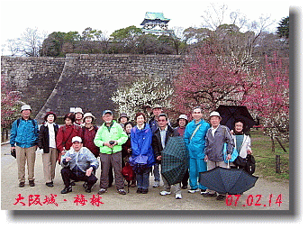 | 2007.02.14 「緑陰クラブ」の月例郊外ウォーキングで大阪城の梅林へ ![]() 今朝の天気予報によると、大阪地方は一日中雨の確率が80%と高く、しかも低気圧の影響で風も強いということでウォーキングには最悪の事態が予想された。 そのため今日の郊外ウォーキングは残念ながら中止かと思っていたが、朝8時頃にはまだ雨が降っていなかったからか、連絡網でとりあえず予定通り決行との連絡が回ってきた。 どれだけ集まるか心配したが、集合場所の阪急梅田駅には男性9名、女性9名が集まった。 梅田駅から大阪城まで歩くと少し距離もあるのだが、あくまでウォーキングが目的なので電車に乗らず歩いていくことになった。途中少し雨がぱらつきはじめたので傘を差しながら歩いたがぱらつき程度のままでたいした雨にはならなかった。 梅田駅からすぐの「お初天神商店街」を通り抜けて、先ずは曾根崎・梅田地区の総鎮守さんで創建1,300年の歴史を誇る「露天神社」( つゆのてんじんじゃ)にお詣り。 ![]() この天神さんの境内には「お初と徳兵衛」の心中のゆかりの碑」が祀られていることから「お初天神」として一般には知られたところだ。 この「お初天神」は、近松門左衛門の初の世話物で「 この世のなごり、夜もなごり。死に行く身をたとふれば、あだしが原の道の霜。一足づつに消えて行く。夢の夢こそあはれなれ。あれ数ふれば暁の。七つの時が六つ鳴りて残るひとつが今生の。鐘のひびきの聞きをさめ。寂滅為楽とひびくなり」の名口上で曾根崎心中の現場として有名なところだ。 同行の元姫さま達も興味深そうにこの碑を眺めていたが、若い頃の胸ときめいた頃の自分を思い出しているのかも.....? ここから一路、裁判所、大阪市役所、中之島中央公会堂などが並び建つ堂島川に沿って約3キロ程歩くと大阪城に到着。 一つ手前の城門から入ってしまったため、一旦大阪城内に入り天守閣を眺めながら内堀の外側に拡がる梅林を目指した。 堂島川から大阪城梅林まではもっと近道があるのだが、城門の入り口を一つ間違えたらしいのでかなりの遠回りになってしまったようだ。 梅林の広さは約1.7ヘクタールの広さがあり、その広大な敷地一杯に、95種類、約1,250本の梅の木が植えられている。 梅林全体ではまだ5分咲き程度だったが、早咲きから遅咲きまであらゆる種類の梅木があり、早咲きの梅などはすでに満開になっているものもかなりあった。 ここの梅林は、すべての木に梅の種類の名札が付けられているので、それぞれ一つ一つ名前と梅花の形を確認しながら園内を歩くのも楽しいものだ。 白梅は特にまろやかな匂いを放っており梅林らしい雰囲気を盛り上げてくれていた。 小雨のため梅林内の地面はかなり湿っていたが、他に適当な場所も見あたらないのでそれぞれ適当な場所に持参のビニールシートを広げて昼食タイムを楽しんだ。 ![]() 梅林を後にして、すぐ近くにある大阪歴史博物館に行こうということになり歩を進めたが、メンバーの一人が隣接するNHKの場内見学も良いのではないかという提案で、最初にNHKのBKスタジオを見学をすることになった。 特に予約の必要もないとのことだったのでここで短時間見学してから大阪歴史博物館を見学した。 ところでNHKの大阪放送局のコールサインは「JOBK」というが、この由来は「J=JAPAN、O=大阪の、B=馬場町の、K=角にある」という意味だが、英語と日本語のチャンポンのちょっとふざけたところからきているということを僕が中学生の時に聞いたことがある。 スタジオといっても公開されている見物コースにはあまり興味を引く物もなかったので一通り見学の後、隣の大阪歴史博物館に入場した。 この歴史博物館は大阪に由来する古代から現代までの歴史を各階ごとに分類して効率よく展示されており、今まであまり知らなかった大阪の街の歴史を段階を追ってよく理解することが出来た。 今回初めてこの博物館を訪れたが、もう一度たっぷり時間をかけて見学に訪れたいと思ったほどだ。 今日は予報通り市内ではかなりの雨が降ったらしいのだが、幸運なことに郊外にいるときは雨もたいしたことはなく、室内にいるときにかなり激しい雨だったらしい。 日頃の行いの良いものばかりの集団だから、天も我々に幸運を与えてくれたのかも知れないと一人合点しながらそれぞれ早めの帰路に就いた。 それでも今日のウォーキングの距離は長かったらしくて、万歩計は16,000歩強を指していた。 |