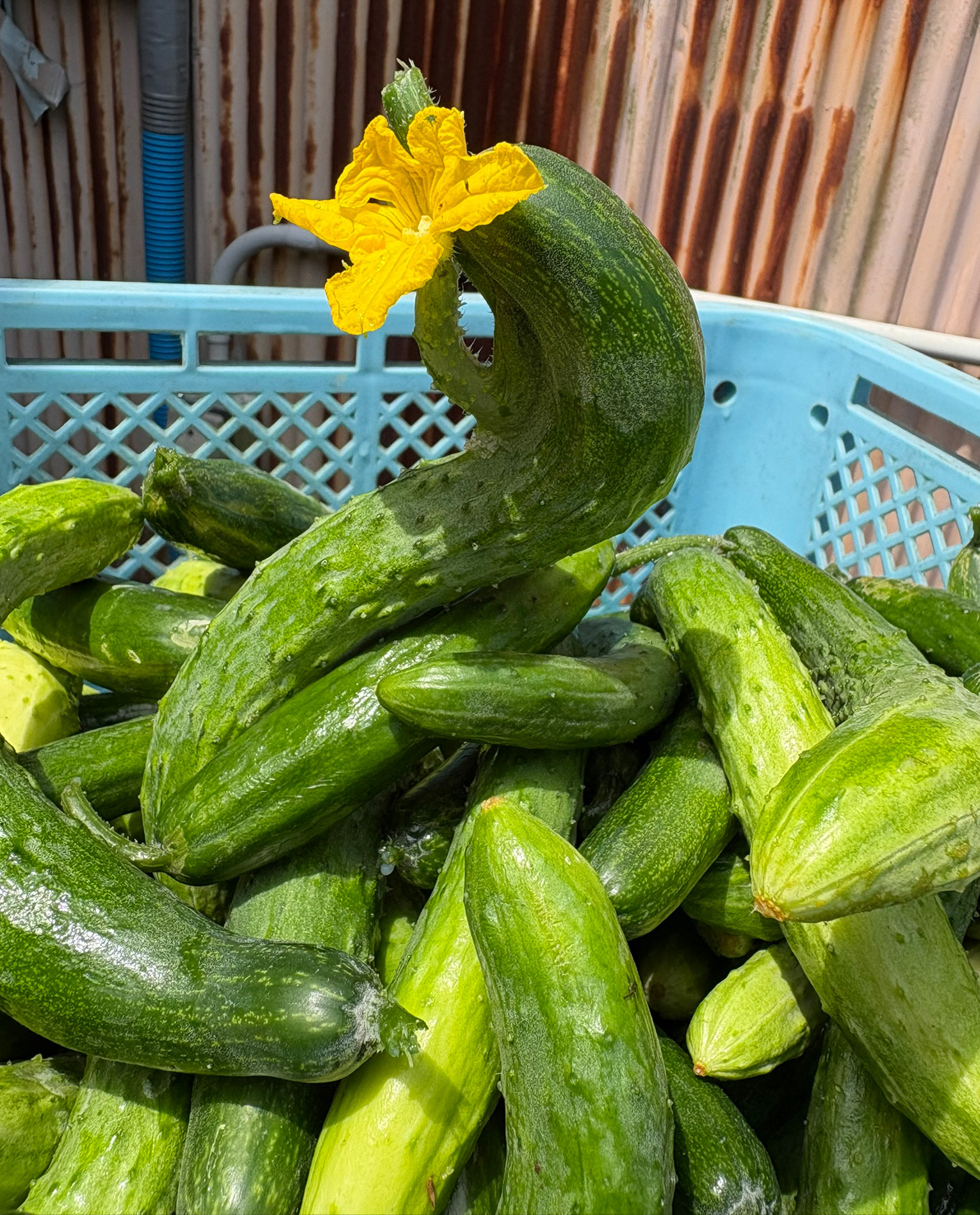 また、うちは地を這う地這胡瓜であるから、土や堆肥、草、虫と接触している胡瓜である。収穫した後に、さっと胡瓜を洗って、土などを取り除く。胡瓜の表面には良い菌も存在するはずで、それを洗い切ってしまわないようにしている。それでも、表面の菌たちは、洗えば少なからず落ちていく。それをバケツで」受けて溜めておいて、胡瓜畑に返す作業もしている。胡瓜は胡瓜の菌を欲するはずであるから。