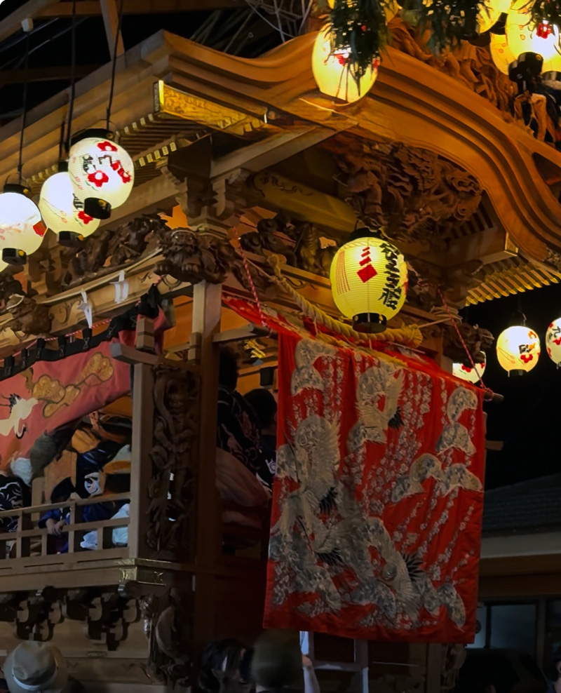 日曜日の朝は8時半に公民館に出向いた。年寄衆が屋台(山車のことをこちらでは屋台と呼ぶ)を引き回すから手伝ってほしいとのことで、湿度80パーセントと蒸し暑い仲を、汗だくで屋台を動かした。屋台を運営するのは中老会という20〜60歳くらいの団体で、自治会の指揮下にある。言ってみれば血気盛んな若い衆である。通常は若い衆が屋台を引き回すけれど、日曜日の朝にはかつての若い衆、つまり年寄衆が引く、という時間だ。そして屋台を引いて、中老会の総代宅まで行き、そこで15分ほど酒盛り。そこからまた自治会長宅まで屋台を引いて行く。中老会が勢揃いし、自治会長に向かって挨拶。自治会長は、それに答えて挨拶して酒盛りが始まるのだ。皆、道路に敷いたブルーシートに座ってテーブルを囲む。用意されたビールやジュース、お茶と、自治会長が手配したオードブルで、しばらく休憩。