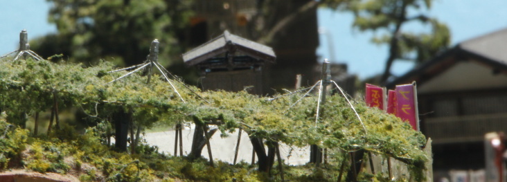 ▼ブドウ棚と吊り手を針金で作り、銅線のコードでブドウの木と長い枝を作る。