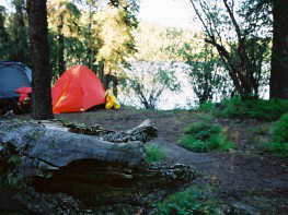 | テント設営の大原則は「食料の近くはダメ!」である。僕らが寝静まった頃に熊が現れた場合、食料の匂いがあるところがまず攻められる。そして近くのテントへと…。 とにかく離れるべしっ!! |
