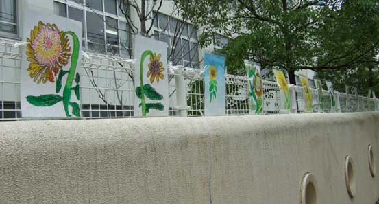 本山第二小学校,本山中学校のフェンスに全国から送られてきたひまわりの絵と一緒に展示されました。 H22-07-25〜08-01