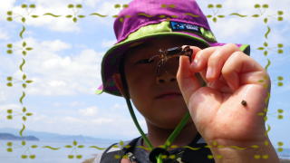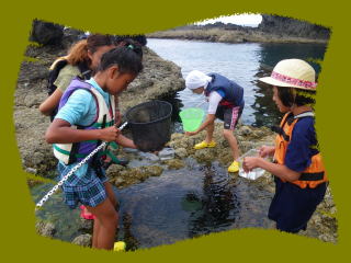 | 磯遊び&散策 箱メガネや網でカニや魚をすくってみたり、丘に登って景色を見たりと自由時間です。 |